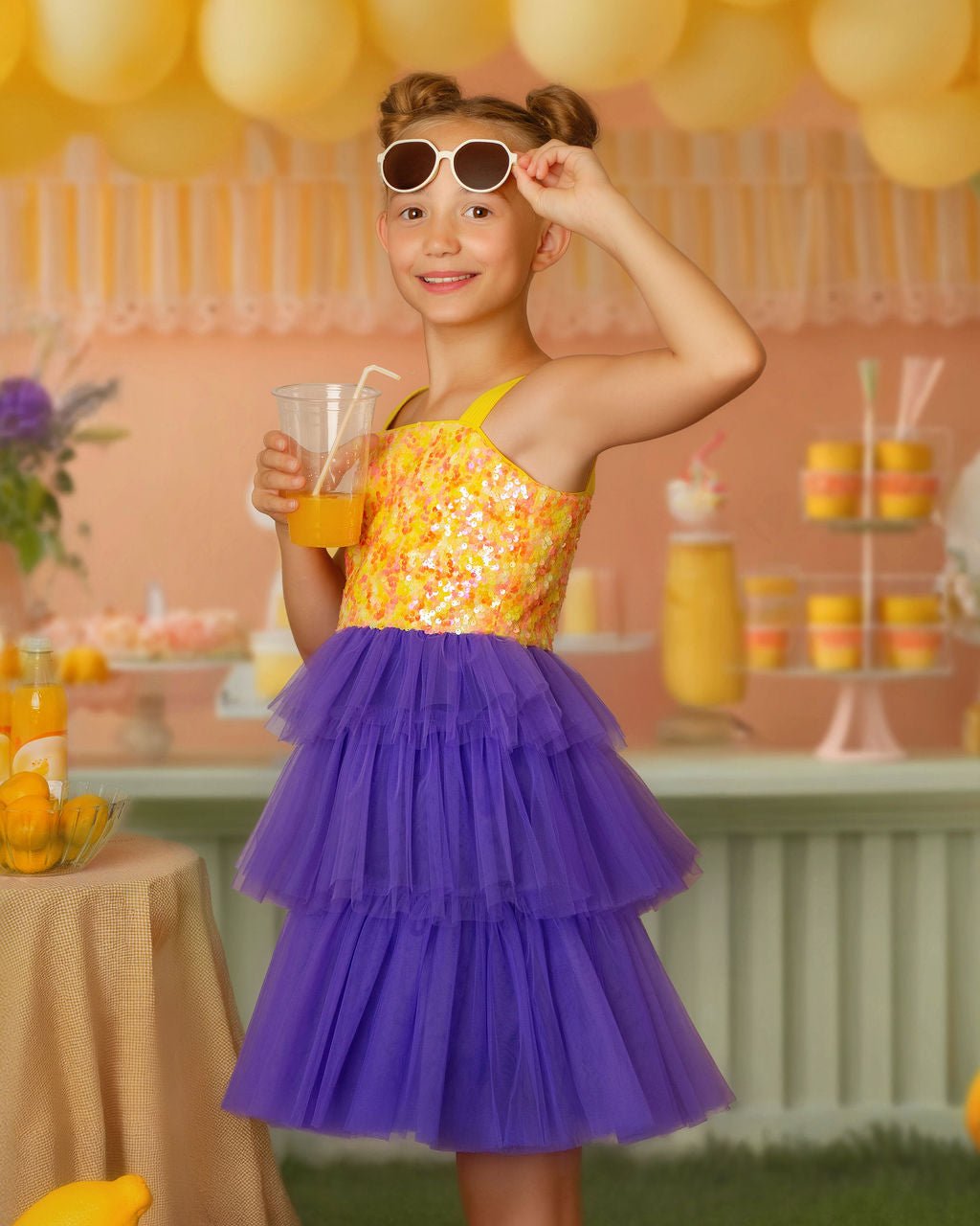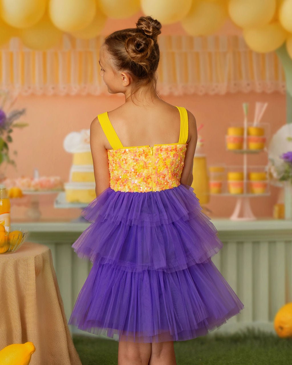 The Citrus Bloom Purple Tulle Party Dress is where bold meets beautiful. Featuring a sparkly citrus-hued sequin bodice and cascading purple tulle tiers, this dress is made for girls who love to twirl and shine.