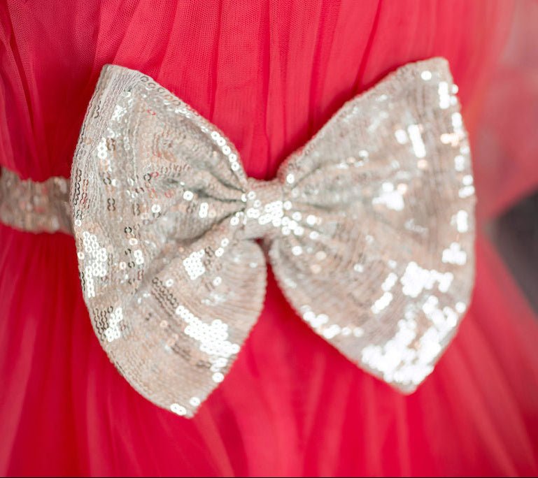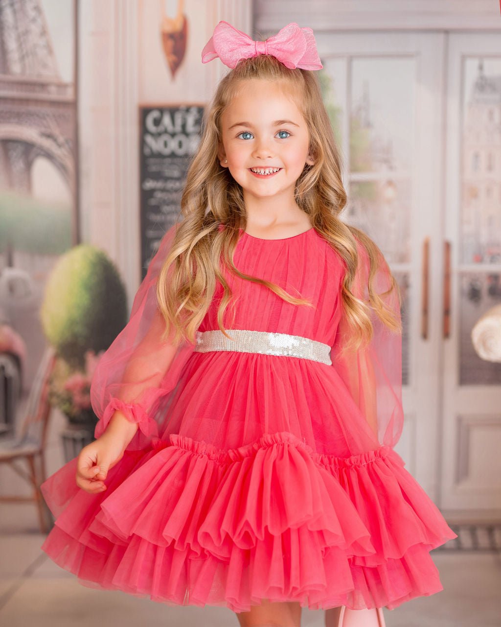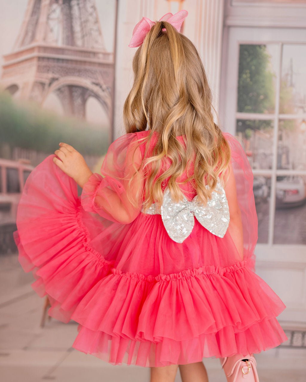 Inspired by the charm of Paris, the Parisian Rosé Tulle Party Dress is a show-stopper made for magical barbie themed birthdays, holiday parties, and twirl-worthy moments. Crafted in a vibrant rose pink hue, this dress features dramatic tiered tulle layers, sheer puff sleeves, and a sparkly sequin bow at the back. A shimmering waistband adds that extra sparkle - perfect for your little one’s most unforgettable moments.