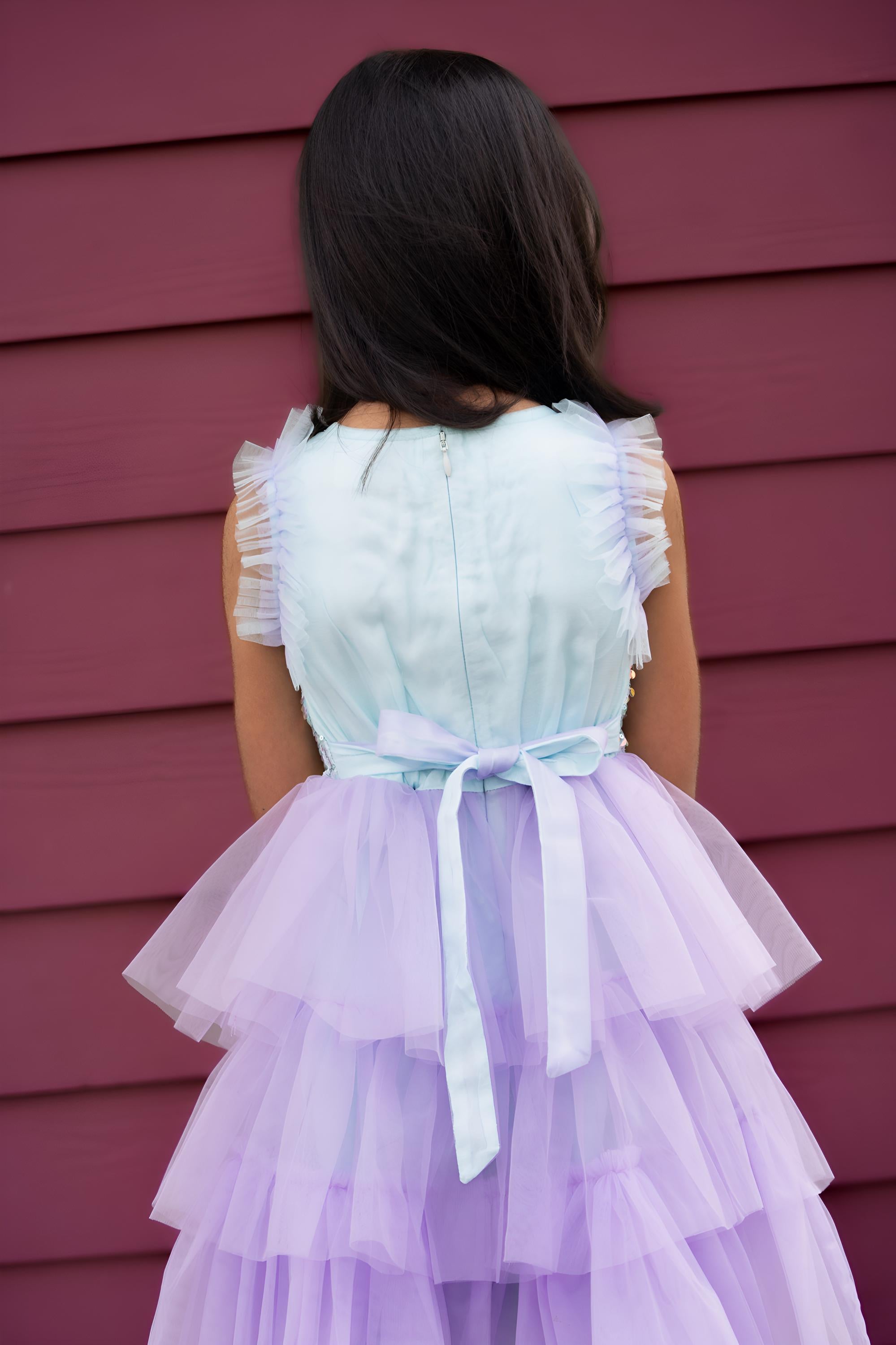 Designed for fairytale moments, this dress features a shimmering sequin bodice, delicate ruffle sleeves, and cascading lilac tulle layers for a magical twirl-worthy look.